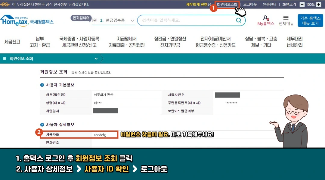 공인인증서나 금융인증서 등으로만 로그인하여서 최초 가입시 아이디를 기억하지 못하는 대표님들이 많습니다.